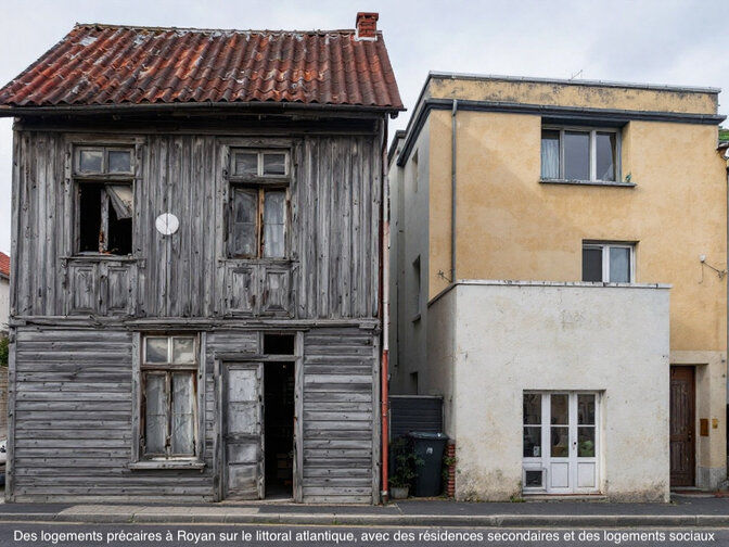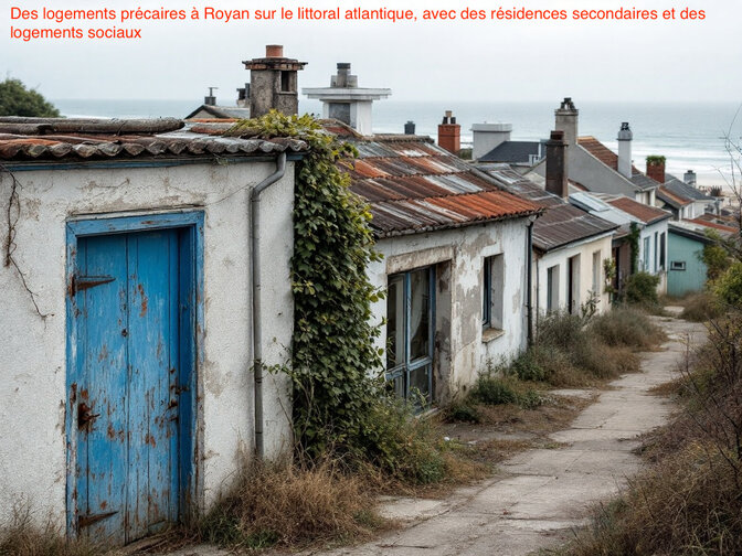 Deuxième photo : "Des logements précaires à Royan sur le littoral atlantique, avec des résidences secondaires et des logements sociaux". Nous hésitons encore pour savoir laquelle des deux maisons menaçant ruine ou bien délabrée est la résidence secondaire ?