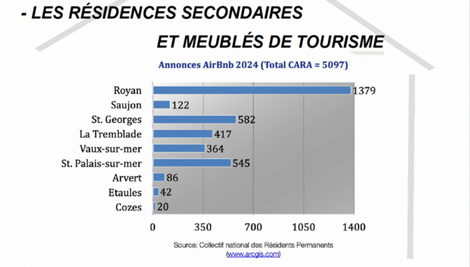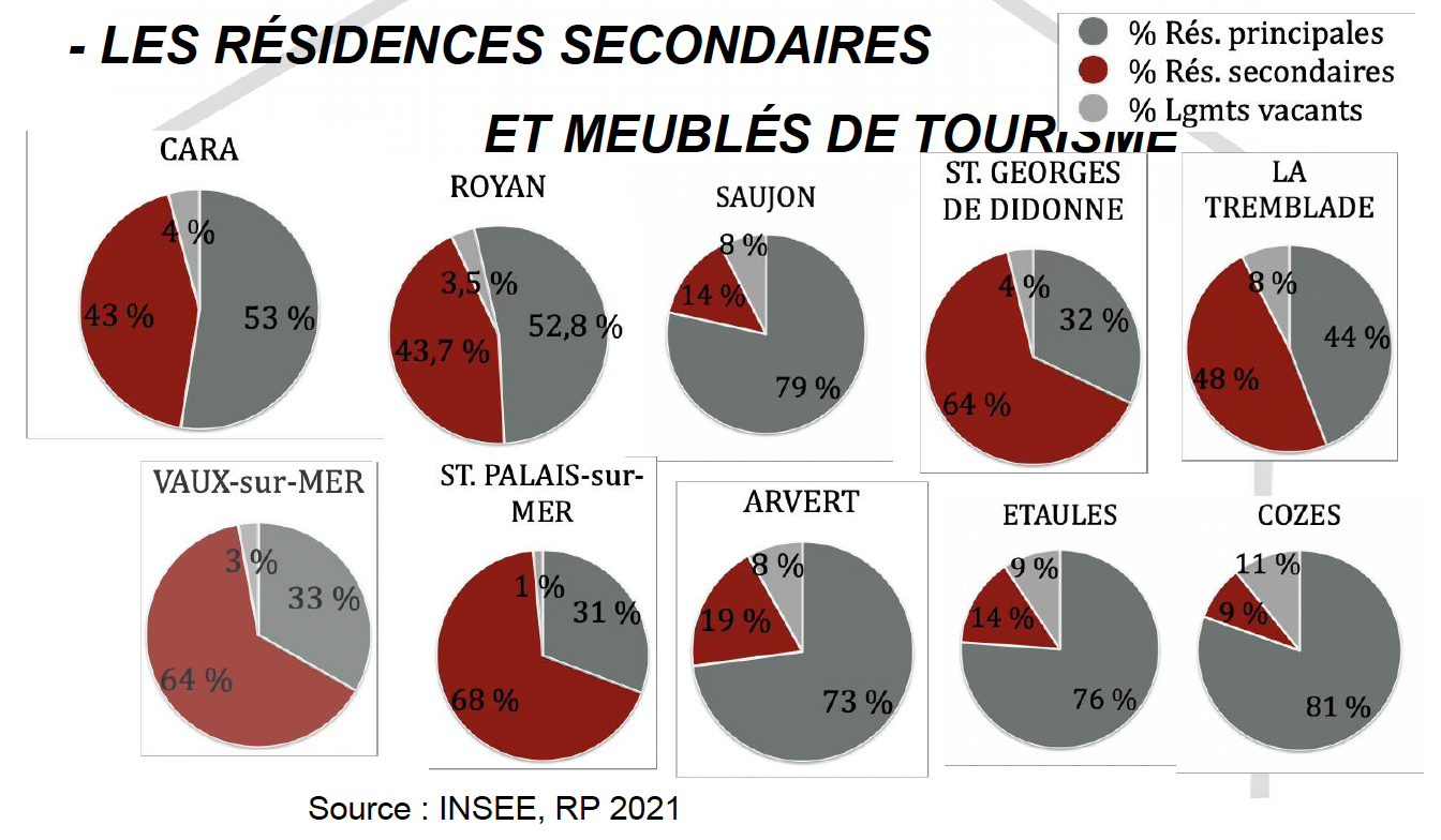 NB : La diapositive présente la répartition entre les résidences secondaires et principales sur la CARA et les logements vacants. Avec 43% de résidences secondaires, le déséquilibre est flagrant, particulièrement sur certains communes, notamment Saint-Georges-de-Didonne, Vaux-sur-Mer ou Saint-Palais sur Mer.